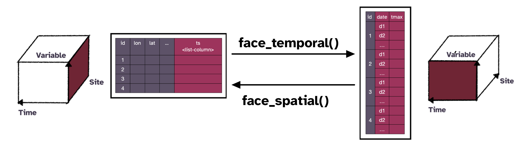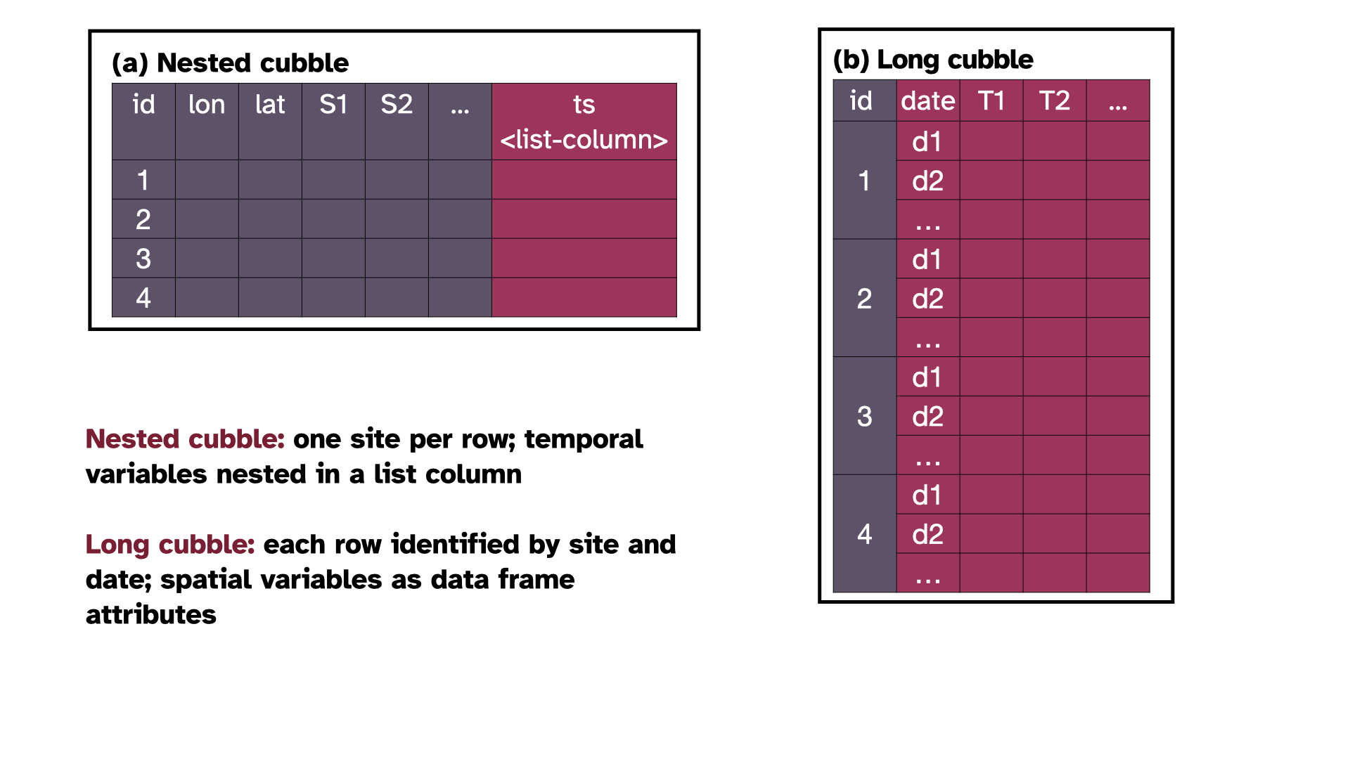 Cubble is a nested object built on tibble that allow easy pivoting between spatial and temporal form.