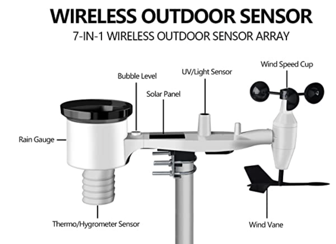 Physical sensors that measure the temperature, rainfall, and wind speed & direction